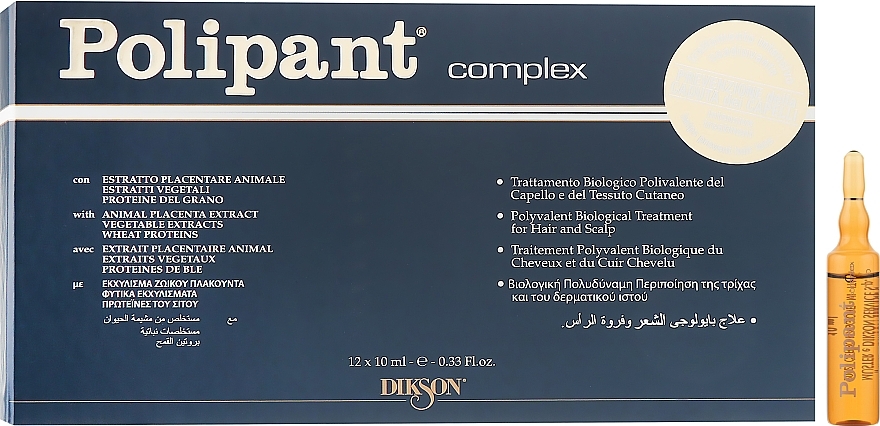 Dikson Polipant Complex (Комплекс с плацентарными и растительными экстрактами, протеинами против выпадения и для активизации роста волос) — интенсивное ампульное средство, разработанное для укрепления волосяных луковиц, стимуляции роста и восстановления структуры волос. Работает одновременно с кожей головы и по длине, возвращая шевелюре плотность, силу и жизненную энергию.